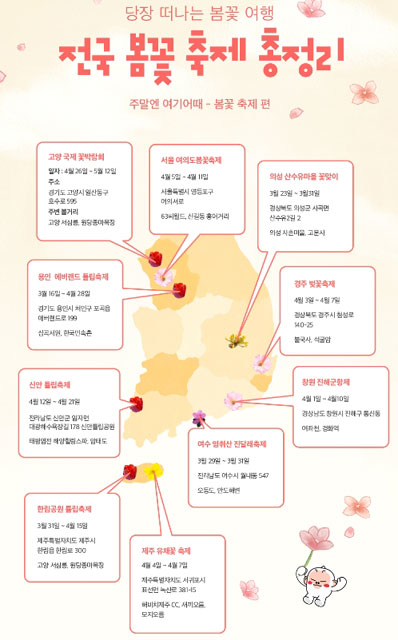 또한 여기어때는 전국 봄꽃축제를 한 데 모았다. 용인 에버랜드 튤립축제와 의성 산수유마을 꽃맞이, 경주 벚꽃축제, 제주 유채꽃 축제, 제주 유채꽃 축제 등 10곳이다. 축제 시기와 위치, 주변 즐길거리를 동시에 소개해 봄맞이 여행을 떠나는 데 도움을 준다.