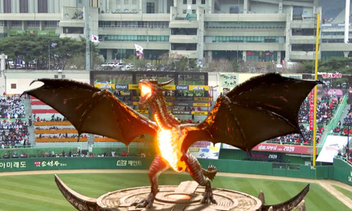 이는 증강현실(AR) 기술을 이용해 선보인 것. 경기장을 찾은 관중들은 전광판을 통해 이를 봤고 시청자들은 날아다니는 비룡의 모습을 실시간으로 확인했다.