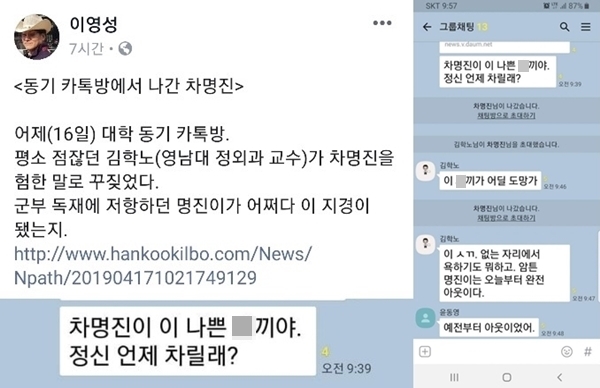 김 교수가 차 전 의원 관련 기사를 공유하며