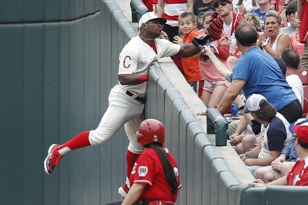 6회 초 2사 만루에서 타석에 들어선 류현진은 우익수 쪽 파울 라인 밖으로 타구를 보냈다. 그러자 우익수로 나선 푸이그는 펄쩍 뛰어 올라 관중석으로 향하는 공을 걷어냈다.
