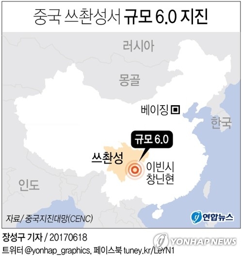 중국 서남부 쓰촨성 이빈시 창닝현에서 규모 6.0의 지진이 발생했다.