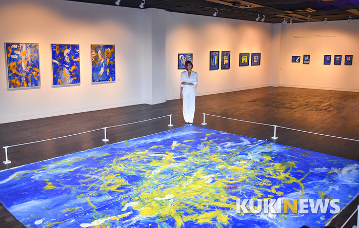 솔비는 인사아트센터에서 ‘리얼 리얼리티’(Real Reality)란 제목으로 개인전을 열고 있다. 2017년 시작한 ‘하이퍼리즘’(HYPERISM) 시리즈의 세 작품 ‘레드’, ‘블루’, ‘바이올렛’이 이번 전시를 통해 관람객들을 만난다. 2년 만에 시리즈를 마친 솔비는 “속이 후련하다”며 웃었다. 미술관에는 그림뿐 아니라 솔비가 쓴 글과 작업 과정을 담은 영상도 걸려 있다. “나만의 방식으로 관람객의 이해를 돕고 싶어” 마련한 장치다.