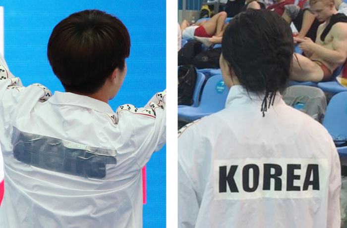 한국 다이빙의 간판 우하람은 경기장에 입장할 때 영문 국가명 ‘KOREA’가 들어가야 할 자리에 은색 테이프를 붙인 유니폼 상의를 입었다. 우하람의 유니폼에서 테이프로 가린 것은 제조사 로고였다.