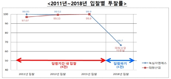 그 결과, 2011년 입찰, 2013년 입찰, 2015년 입찰에서 99% 이상이라는 높은 투찰률로 낙찰을 받게 됐다. 담합이 파기된 것으로 보이는 2018년 입찰에서 투찰률이 66.7%로 급감한 것을 비추어볼 때 이례적으로 높은 투찰률이다.