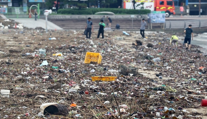 특히 지난 사흘 동안 최대 360mm에 달하는 비가 내린 부산지역에는 휴가객을 한창 맞이하던 해안가가 초토화됐다. 부산 수영구 광안리해수욕장에는 높은 파도에 떠밀려온 쓰레기가 백사장 1㎞를 덮었다. 송정해수욕장 등 다른 해수욕장도 상황은 마찬가지였다. 부산 일대 해수욕장 7개소가 입욕이 금지된 채 쓰레기 청소작업 등 복구작업에 한창이다.