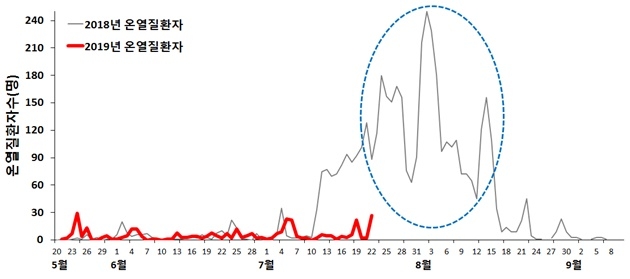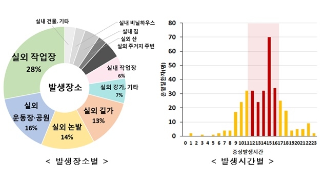 지난해에도 7월 말부터 8월 초까지 온열질환자의 62%가 신고돼 이 시기에 환자발생이 집중된 바 있으며, 올해도 같은 추세가 이어질 것으로 보인다.