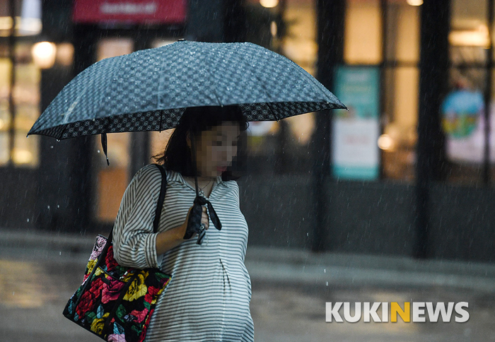 중부지방에 호우경보가 발령된 26일 오전 서울 상암동 일대에서 쏟아지는 굵은 빗줄기 속을 시민들이 걸어가고 있다.