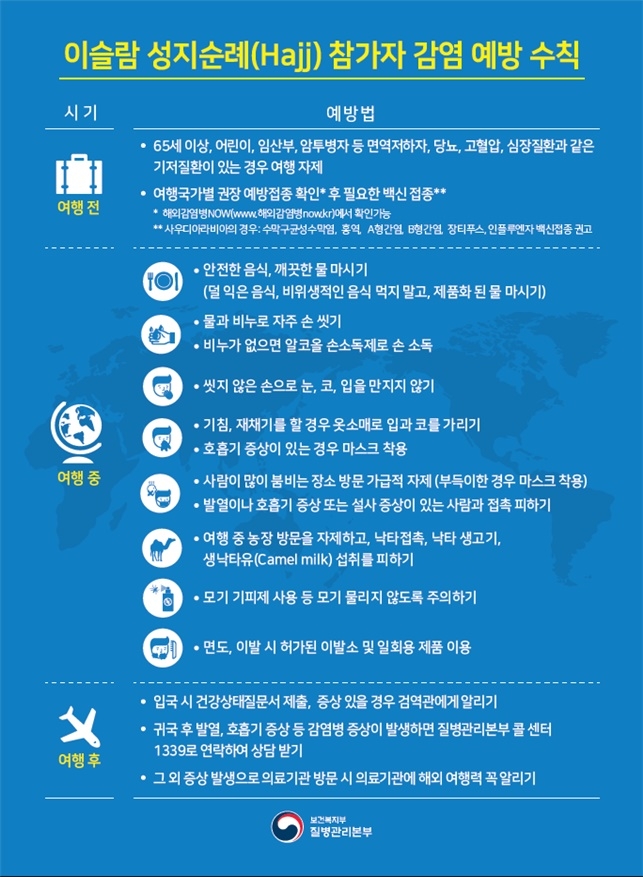 질본은 이슬람 성지순례 기간 중 메르스 국내 유입 차단을 위해 외교부, 주한사우디아라비아 대사관 및 성지순례 전문 여행사와 협력하여 참가자를 대상으로 예방수칙을 안내하고, 입국 시 검역을 강화하며 지역사회에서의 조기발견을 유도할 예정이다.