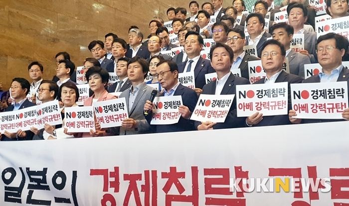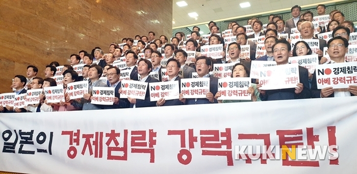 이들의 질타와 주장에 민주당 소속 의원들도 동의하는 모습이었다. 의원일동은 규탄성명을 통해 “일본 정부의 화이트리스트 배제는 자유무역질서를 교란하는 동시에 정경 분리의 원칙을 훼손하는 부당한 결정”이라며 “우리 대법원의 강제징용 배상판결에서 비롯됐다는 점에서 안보상의 이유라는 일본 정부의 주장은 명백한 기만”이라고 평했다.