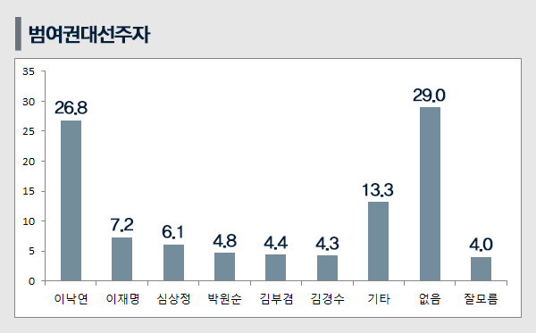 범여권에서 이낙연 총리를 제외한 선호도 순위는 변화가 일부 있었다. 지난 조사에서 6.6%의 선호도로 2위를 차지했던 심상정 정의당 의원이 금번 조사에선 6.1%를 기록하며 3위로 밀려났다. 반면 6.5%로 3위였던 이재명 경기도지사 선호도는 7.2%로 올라 2위가 됐다. 박원순 서울시장의 경우 5.1%에서 4.8%로 선호도가 0.3%p 하락했지만 순위는 유지했다.