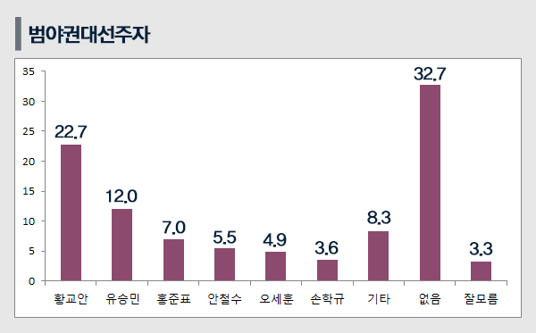 범여권에서 이낙연 총리의 선호도가 독보적이라면 야권 또한 1인 독주가 이어지고 있다. 차기 대선주자로 꼽히는 범야권 인사들 중 가장 높은 선호를 보인 인물은 22.7%를 받은 황교안 자유한국당 대표였다. 다만 선호도는 26.0%를 기록했던 직전 조사결과를 넘어 1달 전 조사결과인 23.8%보다도 1.1%p 떨어졌다.