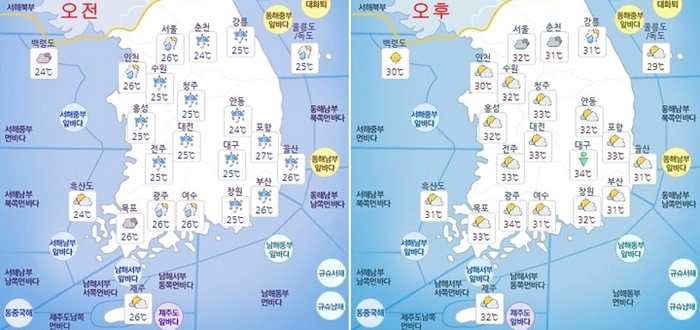 비는 서울. 경기내륙과 충남내륙은 아침(09시)까지, 강원영서와 충북, 경북은 오전(12시)까지, 강원영동은 오후(18시)까지 비가 이어지는 곳이 있겠다. 제주도를 포함해 남부내륙에는 대기불안정으로 오후(12~18시)에 소나기가 올 전망이다.