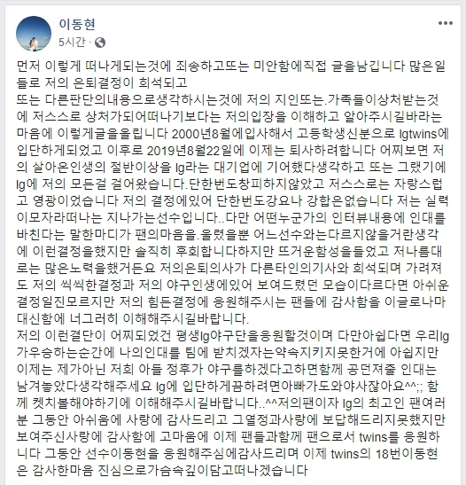 이동현은 SNS에 “많은 일들로 저의 은퇴 결정이 희석되고 또는 다른 판단의 내용으로 생각하시는 것에 저의 지인 또는 가족들이 상처받는 것에 저 스스로 상처가 되어 떠나기 보다는 저의 입장을 이해하고 알아주시길 바라는 마음에 이렇게 글을 올립니다”라며 운을 뗐다.