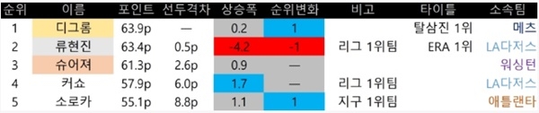 3경기에서 18실점을 기록하며 급격한 슬럼프에 빠진 류현진(LA 다저스)이 사이영상 경쟁에서 뒤처지는 모양새다. 줄곧 1위를 지켜오던 톰 탱고 사이영상 포인트에서 제이콥 디그롬(뉴욕 메츠)에게 밀려 2위로 내려앉았다.