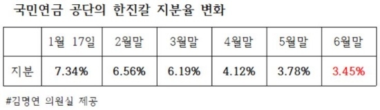 김명연 의원에 따르면 1월 16일 국민연금이 한진칼에 대한 주주권 행사를 시사할 당시 지분은 7.34%였으나 정관변경 안건이 상정된 직후인 3월 말에는 보유지분이 6.19%, 4월말 4.12%, 5월말 3.78%, 6월말 3.45%로 지속적인 지분 매도가 이루어졌다.