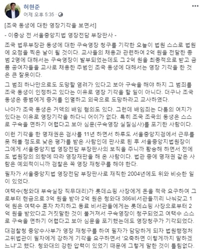 허 전 행정관은 9일 자신의 SNS에 올린 ‘조국 동생에 대한 영장기각을 보면서’라는 글에서 “교사들의 채용과 관련하여 2억 원을 전달한 종범 2명에 대해서는 구속영장이 발부되었는데도 그 2억 원을 최종적으로 받고 금품 공여자들을 교사로 채용한 주범인 조국 동생에 대해서는 영장 기각을 한 것은 큰 잘못”이라며 이같이 말했다.