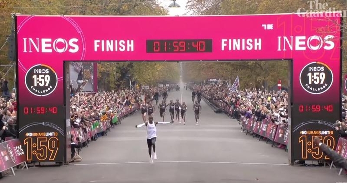 엘리우드 킵초게는 12일 오스트리아 빈 프라터 파크에서 열린 ‘INEOS 1:59 챌린지’에서 마라톤 풀코스(42.195km)를 1시간59분40초에 주파했다. 마라톤 풀코스를 100m당 평균 17초06 속도로 2시간을 쉽지 않고 달린 셈이다.