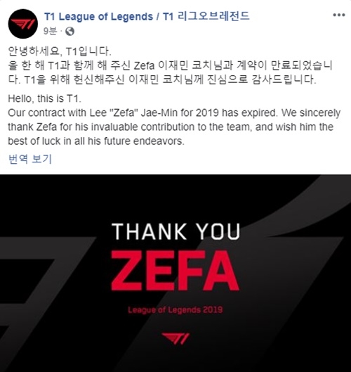 SKT는 20일 공식 SNS를 통해 이재민 코치와의 계약이 만료됐다고 전했다.