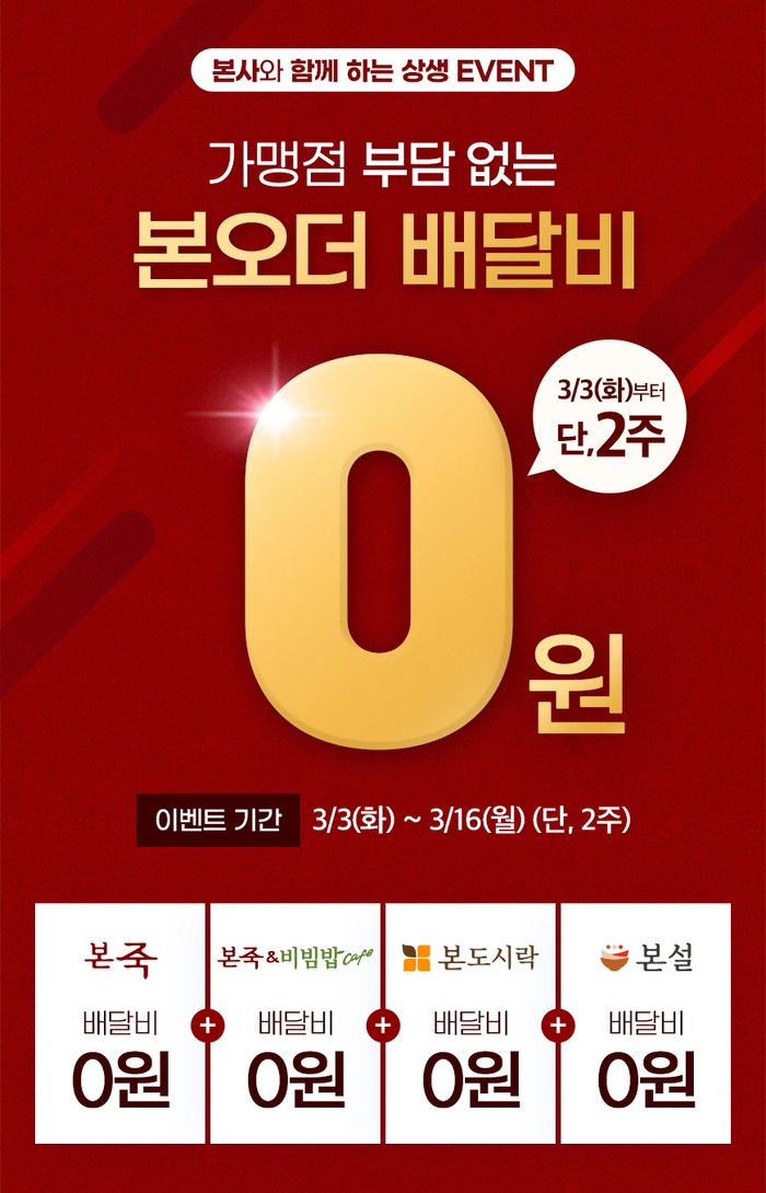 오는 16일까지 고객이 본오더에서 메뉴 주문 시 발생하는 기본 배달비를 본사가 전액 부담한다. 코로나19 사태로 배달음식을 주로 찾는 고객은 배달비 부담 없이 본오더를 통해 죽, 도시락, 설렁탕 등 다채로운 메뉴를 만나볼 수 있다. 가맹점 입장에서도 본오더를 통한 배달음식 소비가 증가할 것으로 예상되면서 매출 증대를 도모할 수 있다.