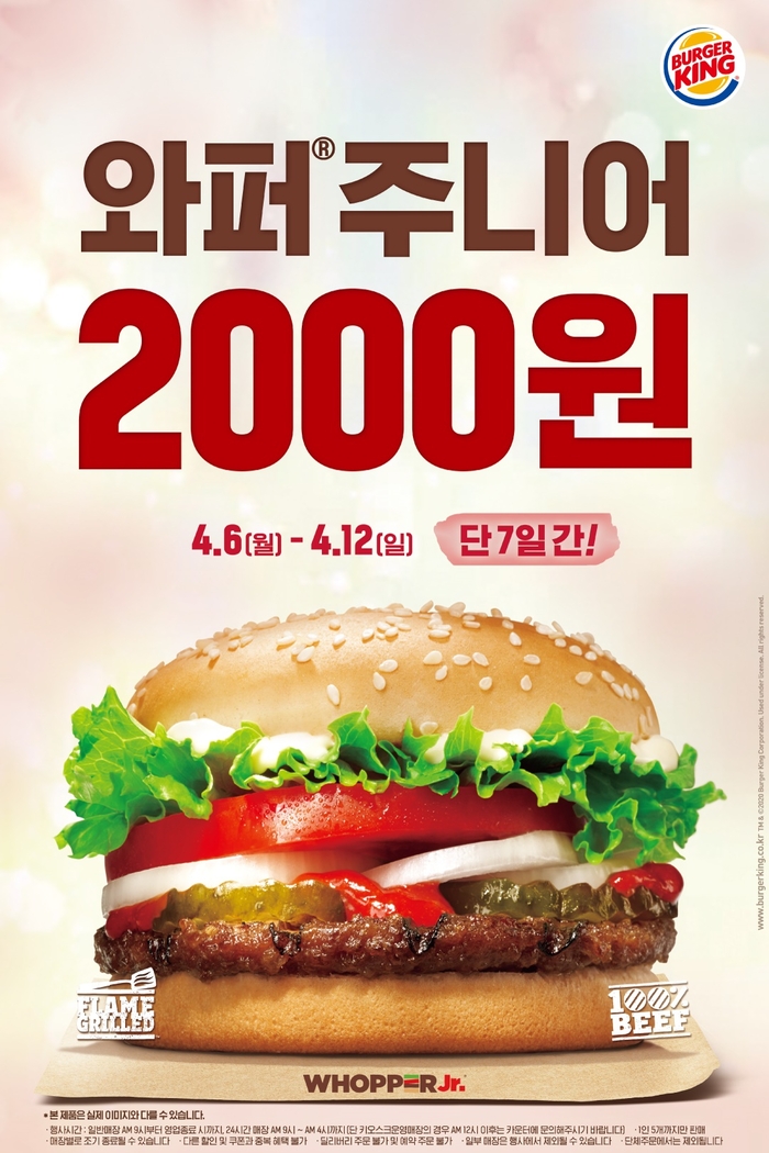 7일 버거킹은 오는 12일까지 와퍼주니어와 불고기와퍼주니어 단품을 2,000원에 할인 판매하는 프로모션을 실시한다고 밝혔다. 300원을 추가하면 치즈 와퍼주니어로 주문할 수 있다.