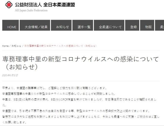 연맹에 따르면 나카자토 이사는 지난 5일 발열 증상을 처음 느꼈다. 이후 8일 검체 검사를 받고 12일에 확진 판정을 받았다.