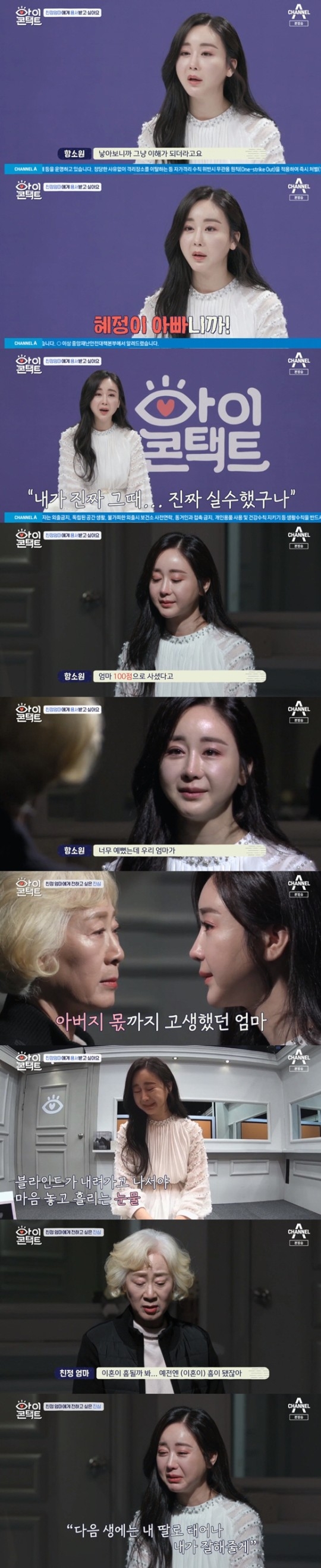 딸 혜정이를 낳고서야 어머니의 마음이 이해가 됐다는 함소원은 “어렸을때 엄마에게 내가 진짜 실수했구나, 그렇게 말하는게 아니었구나라는 생각이 들었다”고 후회하며 눈물을 보였다.