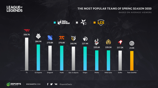 e스포츠 통계를 다루는 사이트 e스포츠 차트는 19일 공식 SNS를 통해 ‘2020 롤 스프링 시즌’ 팀별 평균 시청자 수를 공개했다. 중국 플랫폼 통계는 기록하지 않아 중국팀은 제외됐다.