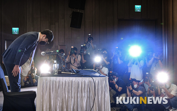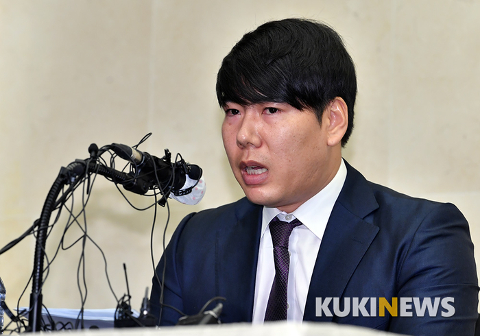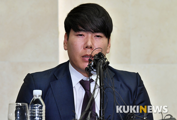 [상암=쿠키뉴스] 문대찬 기자 =1295일 만의 공식석상. 강정호가 23일 오후 2시 서울 상암 스탠포드호텔에 마련된 기자회견장에 등장하자 카메라 플래시가 연신 터졌습니다. 단상에 서서 짧게 고개를 숙인 강정호는 미리 준비한 사과문을 천천히, 그러나 더듬으면서 읽어 내려갔습니다.