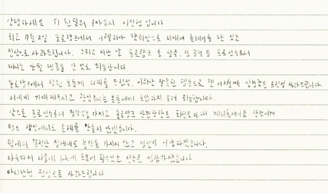 이민형은 “솔로 랭크 중 프로 선수로서 해서는 안 될 행동을 해 죄송하다”며 “앞으로 프로 선수로서 경각심을 가지고 솔로 랭크 한 판 한 판도 최선을 다해 매너 플레이를 할 것이며 평소 행실에서도 문제를 만들지 않겠다”고 전했다.