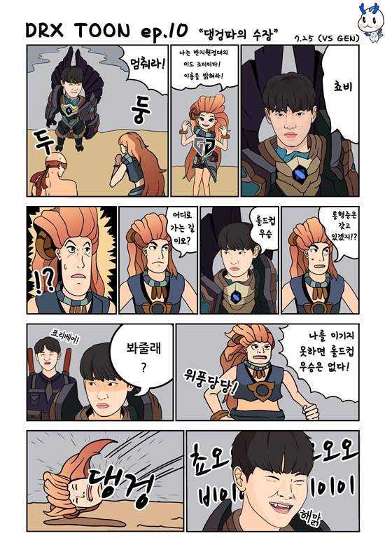DRX는 경기 후 공식 SNS를 통해 웹툰 하나를 공개했다. 관우의 오관돌파 이야기를 담은 ‘요코야마 미츠테루 삼국지’의 유명 장면을 패러디 한 ‘DRX TOON ep. 10’에서는 관우로 등장한 ‘쵸비’ 정지훈(DRX)이 ‘비디디’ 곽보성(젠지)의 목을 ‘뎅겅’ 자르는 장면이 나왔다. 승리 자축과 함께 ‘뎅겅파(공격적인 선수)’의 수장이라 불리는 두 선수의 맞대결에서 정지훈이 웃었다는 점을 강조했다.