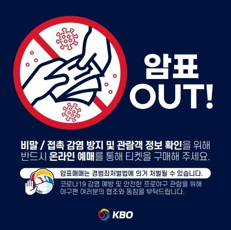 KBO는 30일 “제한적인 좌석 판매(현재 경기장 수용 인원의 10%)로 인해 온·오프라인에서 암표 매매가 발생하는 등 정당하게 티켓 구매를 하려는 야구팬들이 피해를 보고 있다”며 “야구팬들의 피해를 막고자 암표 근절 대책을 마련하고, 관리 강화에 나서기로 했다”고 밝혔다. 암표는 정보 추적이 어렵고 구매 과정에서 접촉 또는 비말 감염의 우려가 있다.