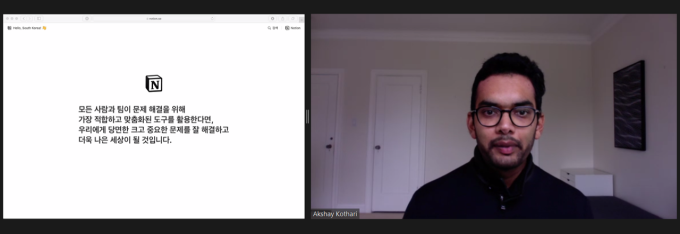 이어 악샤이 코타리 노션 COO는 "노션은 여러가지를 할 수 있도록 개인페이지부터 팀 페이지까지 지원한다"며 "워크스페이스 안에서 팀과 함께 일을 할 수 있는 게 장점"이라고 노션의 서비스 강점을 소개했다.