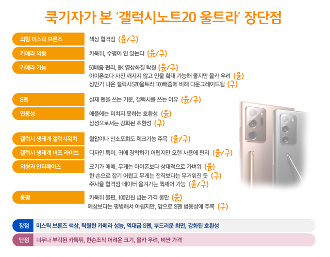 삼성전자가 최근 선보인 갤럭시노트20(울트라 포함)이 첫날 개통량 역대 최고치를 기록하며 흥행을 잇고 있다는 평가다. 쿠키뉴스 전자‧IT담당인 윤은식‧구현화 기자가 갤럭시노트20 울트라를 써보고 얘기를 나눴다. 아이폰 생태계를 벗어난 적 없고, 현재도 아이폰11프로를 사용하는 윤 기자와 갤럭시 시리즈만 주로 쓰고 있는 구 기자는 각각 아이폰과 비교한 갤럭시의 지향점, 그리고 전작에서의 진화에 초점을 맞추며 리뷰했다. 두번째 이야기 갤럭시노트20 울트라의 숨겨진 기능을 소개한다.