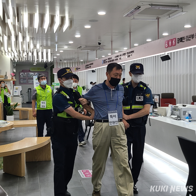 [여주=쿠키뉴스 김정국 기자] 경기도 여주시는 28일 시청 행복민원과에서 민원인의 폭언·폭행 등 비상상황 발생을 가정한 모의훈련을 실시했다.