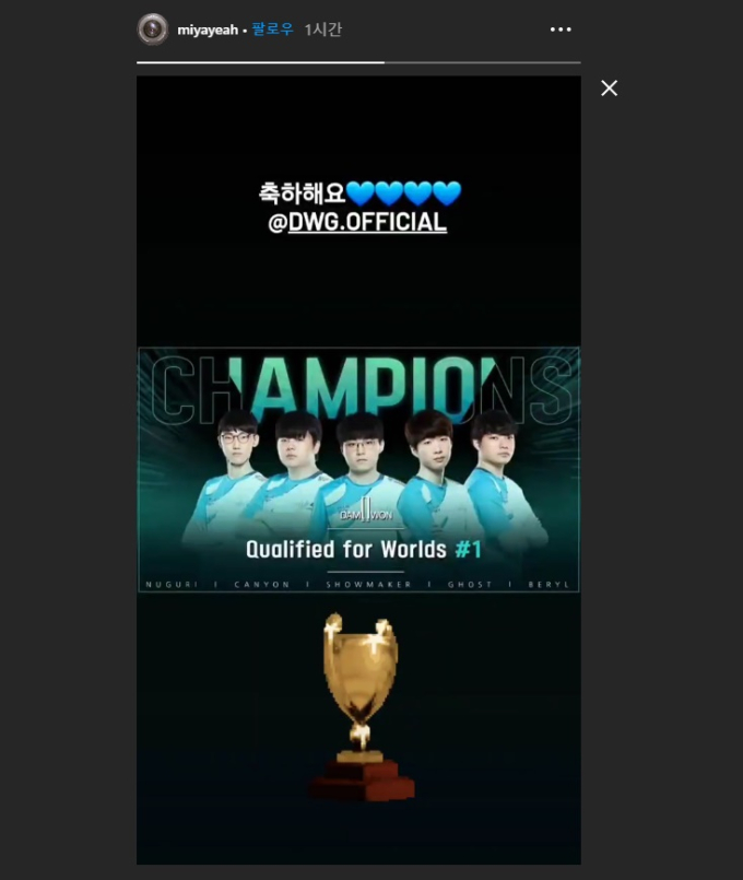 선미는 5일 온라인으로 열린 LCK 결승전이 담원의 승리로 마무리 된 뒤 자신의 인스타그램 스토리에 담원 선수단의 사진과 함께 “축하해요”라는 메시지를 남겼다.