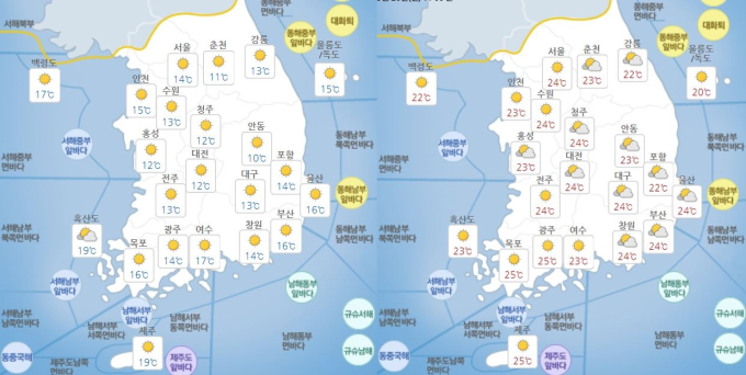 낮 최고기온은 서울 24도, 인천 23도, 청주 24도, 춘천 23도, 강릉 22도, 대전 24도, 대구 24도, 부산 24도, 전주 24도, 광주 25도, 제주 25도 등이다.