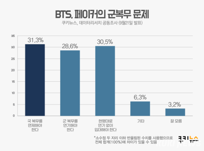 쿠키뉴스의 의뢰로 여론조사 전문기관 데이터리서치가 지난 21일 전국 만 18세 이상 남녀 1000명을 대상으로 가수 BTS, 프로게이머 페이커의 군복무 문제에 대해 질문한 결과, 59.9%가 군복무 면제 혹은 연기에 찬성한다고 밝혔다. 이 가운데 ‘군복무를 면제해야 한다’는 응답은 31.3%로, ‘군복무를 연기해야 한다’는 응답(28.6%)보다 2.7% 더 많았다.