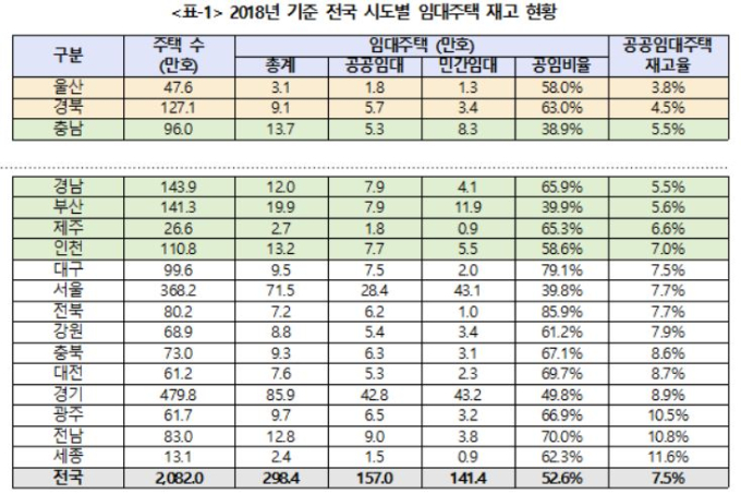 지역별로는 울산광역시가 전체주택 약 47만6000호 가운데 공공임대주택은 3.8%인 약 1만8000호에 불과해 전국 17개 시‧도 가운데 공공임대주택 재고율이 가장 낮았다. 이어 경상북도가 전체 127만1000호 가운데 약 5만7000호로 4.5%에 불과했다. 충남과 경남은 각각 5.5%, 부산이 5.6% 수준이었다.