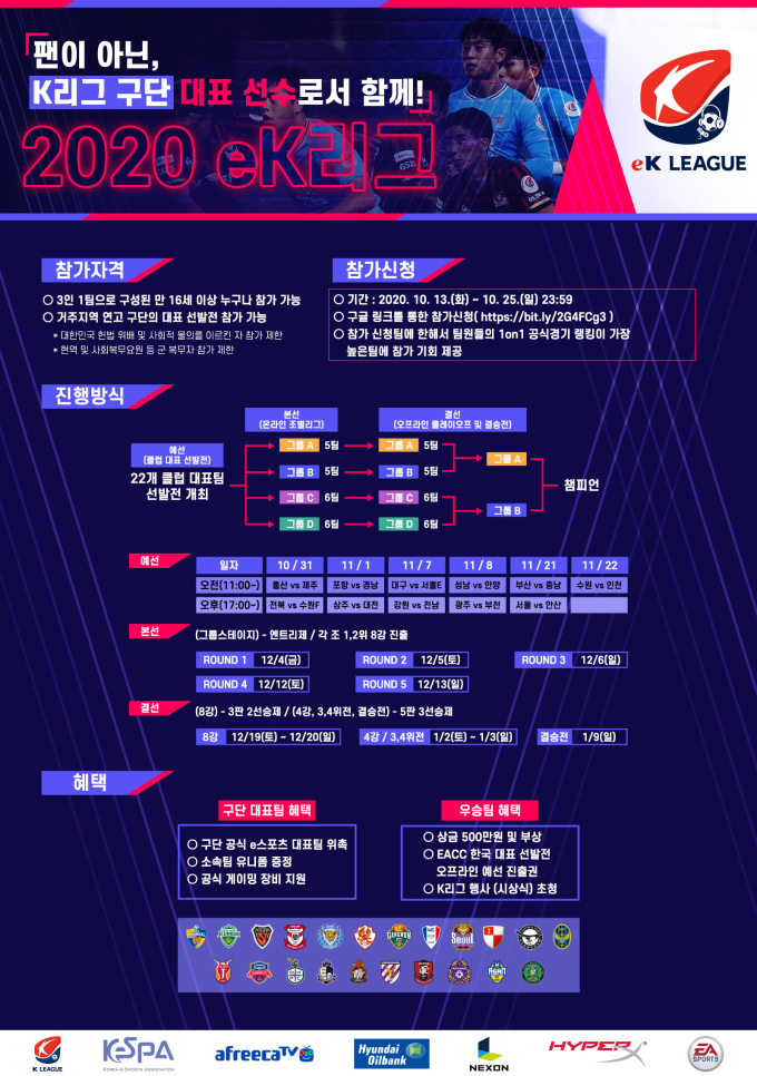 참가 신청은 이달 13일부터 25일까지 신청 링크를 통해서 하면 된다. 지원 자격은 만 16세 이상이며, 3인 1조로 팀을 꾸린 뒤 대표하고자 하는 K리그 구단을 선택해 참가하면 된다.