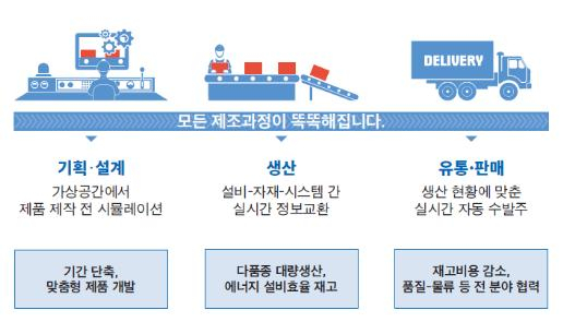 ‘스마트공장’이란, 제품의 기획부터 판매까지 모든 생산과정을 ICT(정보통신기술)로 통합해 최소한의 비용과 시간으로 고객 맞춤형 제품을 생산하는 첨단 지능형 공장을 말한다.