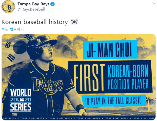 [쿠키뉴스] 문대찬 기자 =미국 프로야구 메이저리그의 탬파베이 레이스가 한국인 야수 최초로 월드시리즈(7전 4승제)에 선발 출전한 최지만을 축하했다.