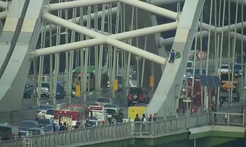 신고를 받고 출동한 경찰과 소방당국은 양화대교 남단에서 북단 방향 4개 차로 중 하위 1개 차로를 통제하고 에어매트를 설치하는 한편 내려오도록 설득했다.