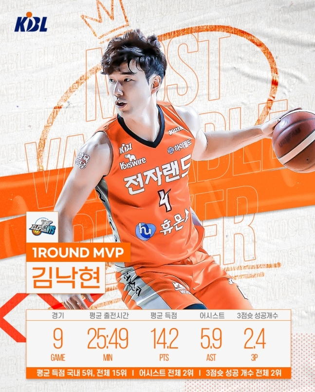 최근 김낙현의 상승세가 도드라진다. 2018~2019시즌 식스맨상을 수상하며 본격적으로 자리매김한 그는 지난 시즌에는 기량발전상을 수상하며 KBL을 대표하는 가드로 자리매김했다. 올 시즌에는 폭발적인 득점력에 더욱 완숙해진 경기 운영으로 전자랜드의 상승세를 이끌고 있다. 이 활약에 힘입어 그는 데뷔 후 첫 라운드 MVP 수상을 받는 쾌거를 이뤘다.