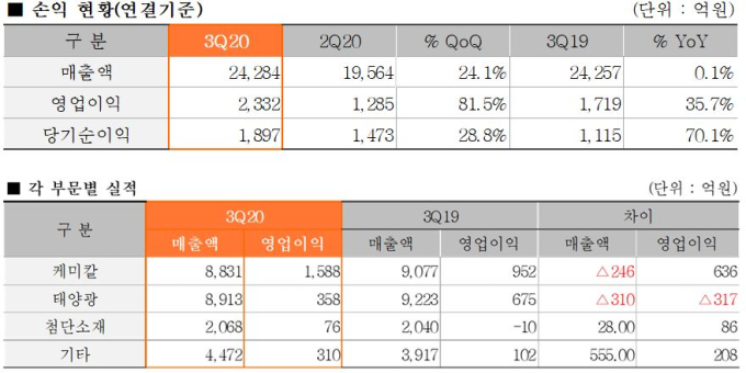 글로벌 완성차 업체의 생산 증가에 따라 부품 수요가 회복했고, 주요 스마트폰 업체의 신제품 출시로 전자소재 사업의 실적이 개선되면서 흑자 전환했다.