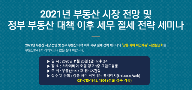 [쿠키뉴스] 조계원 기자 =부동산114는 오는 20일 스카이베이 호텔 경포 그랜드볼룸에서 ‘2021 부동산 시장 전망 및 정부 부동산 대책 이후 세무 절세 전략’을 주제로 세미나를 개최한다고 17일 밝혔다.