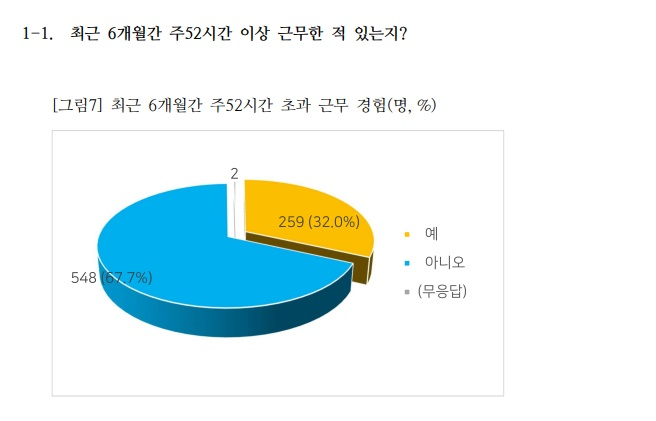 조사결과에 따르면 응답자의 32.0%(259명)는 ‘최근 6개월 동안 주 평균 52시간을 초과해서 근무한 적이 있다’고 답했다.