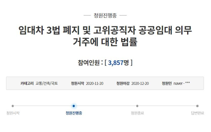 청와대 국민청원 게시판에 올라와 있는 ‘임대차3법 폐지 및 고위공직자 공공임대 의무 거주에 대한 법률’에 동의하는 참여 인원수는 24일 오후 2시50분 기준 3857명으로 집계됐다.