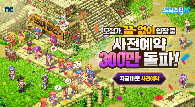[쿠키뉴스] 문대찬 기자 =엔씨소프트(대표 김택진, 이하 NC)의 신작 모바일 MMORPG(다중접속역할수행게임) ‘트릭스터M’이 사전 예약 300만을 돌파했다.