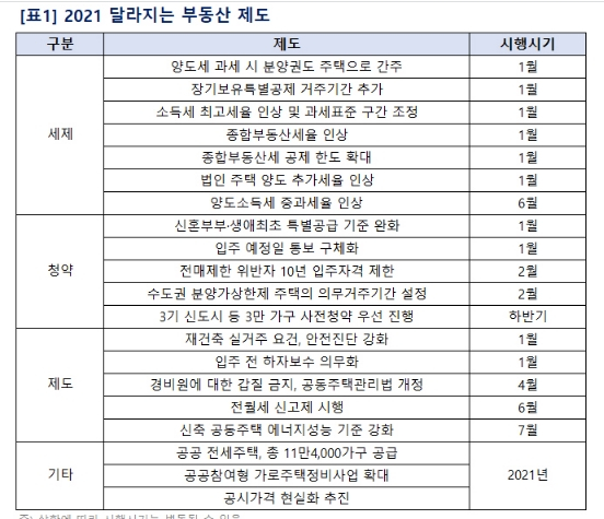 [쿠키뉴스] 조계원 기자 =2020년은 쏟아지는 정부의 부동산 대책 속에서 격변의 시기를 보냈다. 그간 발표된 대책들이 속속 시행되는 2021년에도 이러한 흐름은 지속될 것으로 전망된다. 부동산114는 특히 세제의 변경이 많아 주택 소유자들은 관련 내용을 사전에 숙지할 필요가 있는 것으로 내다봤다.