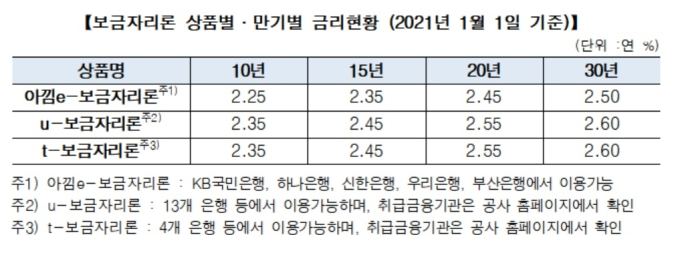 다음 달 1일부터 공사 홈페이지를 통해 신청하는 'u-보금자리론'과 은행 창구에서 신청하는 't-보금자리론'에는 대출 만기에 따라 연 2.35%(만기 10년)∼2.60%(30년)의 금리가 적용된다.